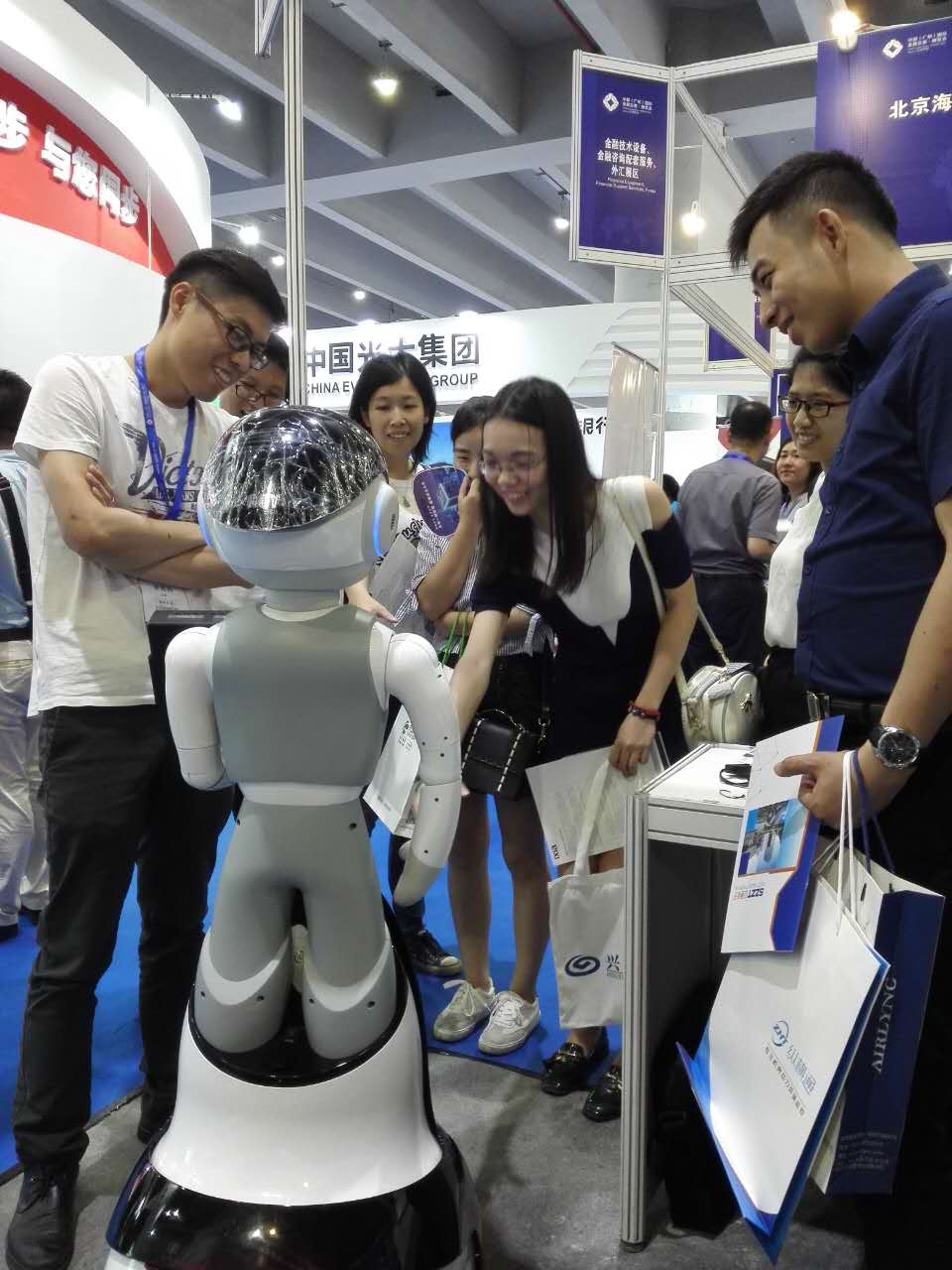 昨日(6月25日),歷時(shí)三天的第六屆中國國際金融交易·博覽會(以下簡稱“金交會”)在廣州圓滿閉幕。本屆金交會以“金融新格局 增長新動能”為主題,展覽總面積4萬平方米,參展機(jī)構(gòu)共356家,設(shè)立18個(gè)主題展區(qū),130多位金融專家學(xué)者出席論壇活動。此次與證通電子一同征戰(zhàn)金交會的是一款智能機(jī)器人FINBOT,三天展會中,F(xiàn)INBOT在現(xiàn)場可謂是吸粉無數(shù)。