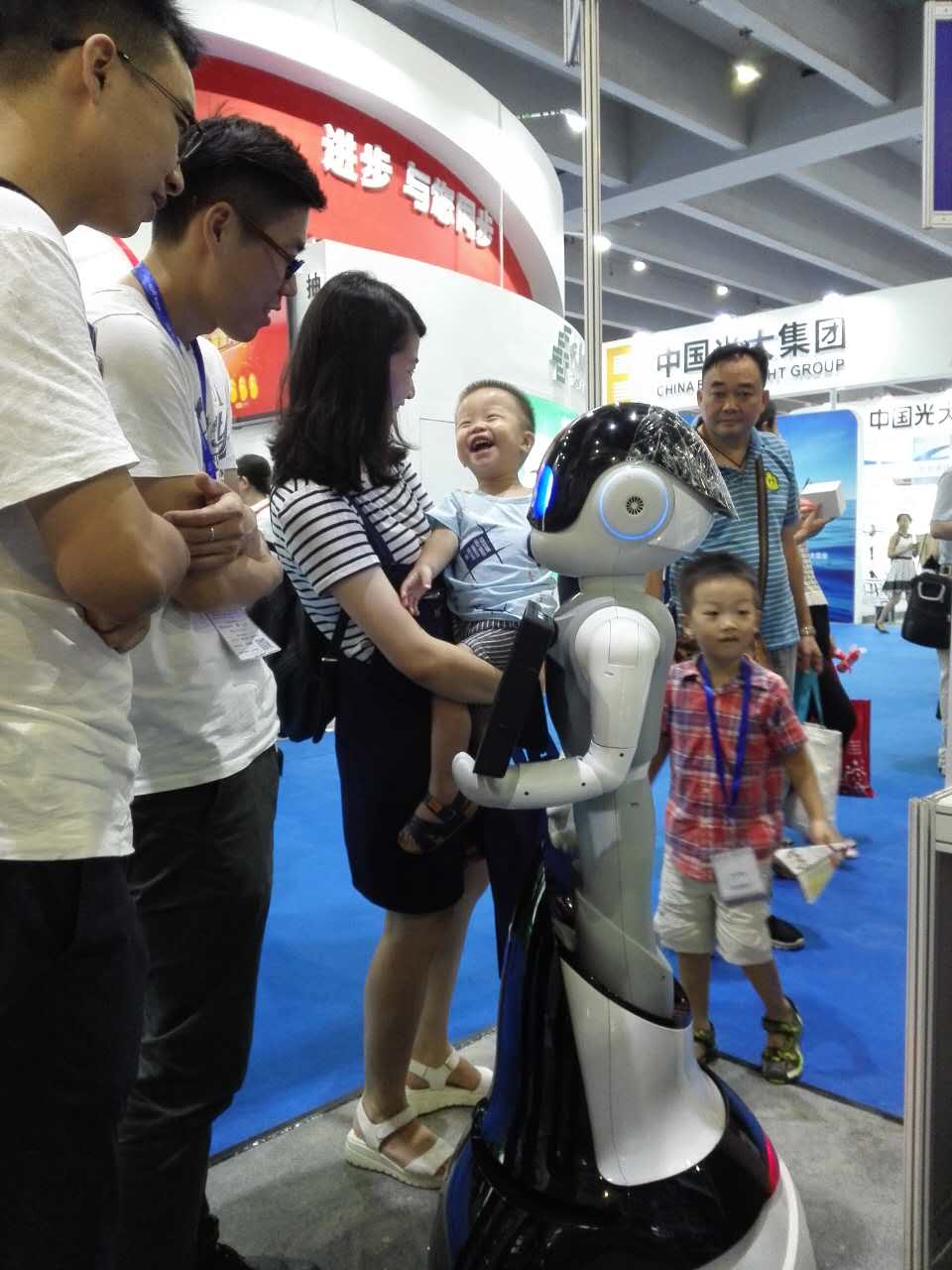 展會現(xiàn)場,不知誰家的小萌娃被FINBOT逗得直樂呵。